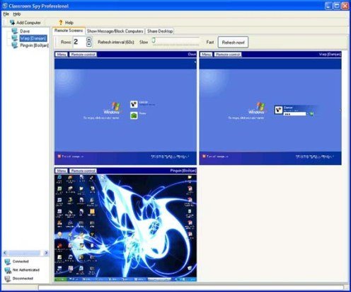 The Classroom Spy - программа предназначена для удаленного контроля и администрирования ПК, позволяет просматривать изображение на экране удаленных компьютеров в режиме реального времени. Несколько инструментов позволят Вам управлять мышью и клавиатурой, выключать, перезапускать, запускать "спящий режим" на отдаленных компьютерах всего одним щелчком. It is hard to teach a group of people how to use a PC, or even how to use a specific program on a PC or the internet. Yes, PC or web training isn't easy. For someone who's doing something right, there are probably two others doing it wrong, playing games, checking email, shopping... Classroom Spy lets you see what everyone's doing - without le